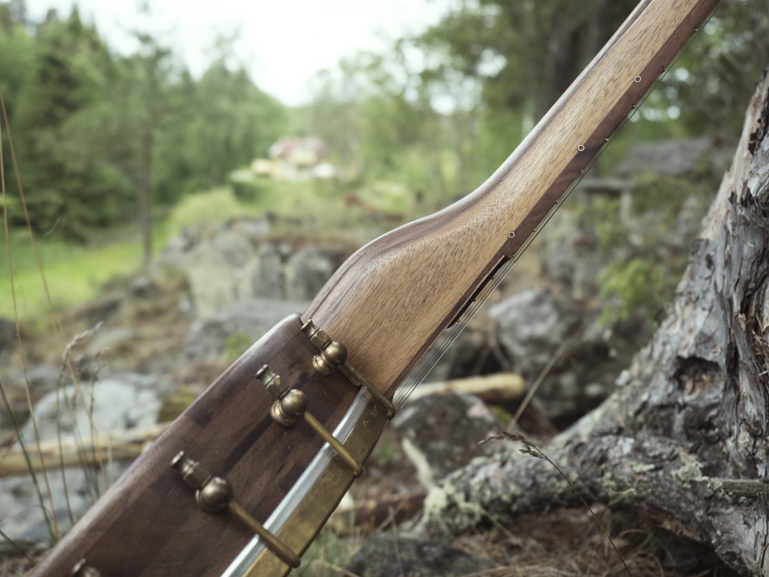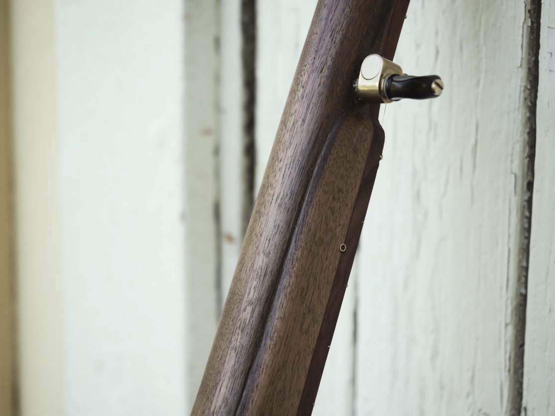 11″, valnöt, bloodwood och pau ferro. 25.5″. Egendesignad mässings urgröpning och dobson tonring. 11″ pot, walnut, bloodwood and pau ferro. 25.5″. Custom brass overlay and dobson tone ring.