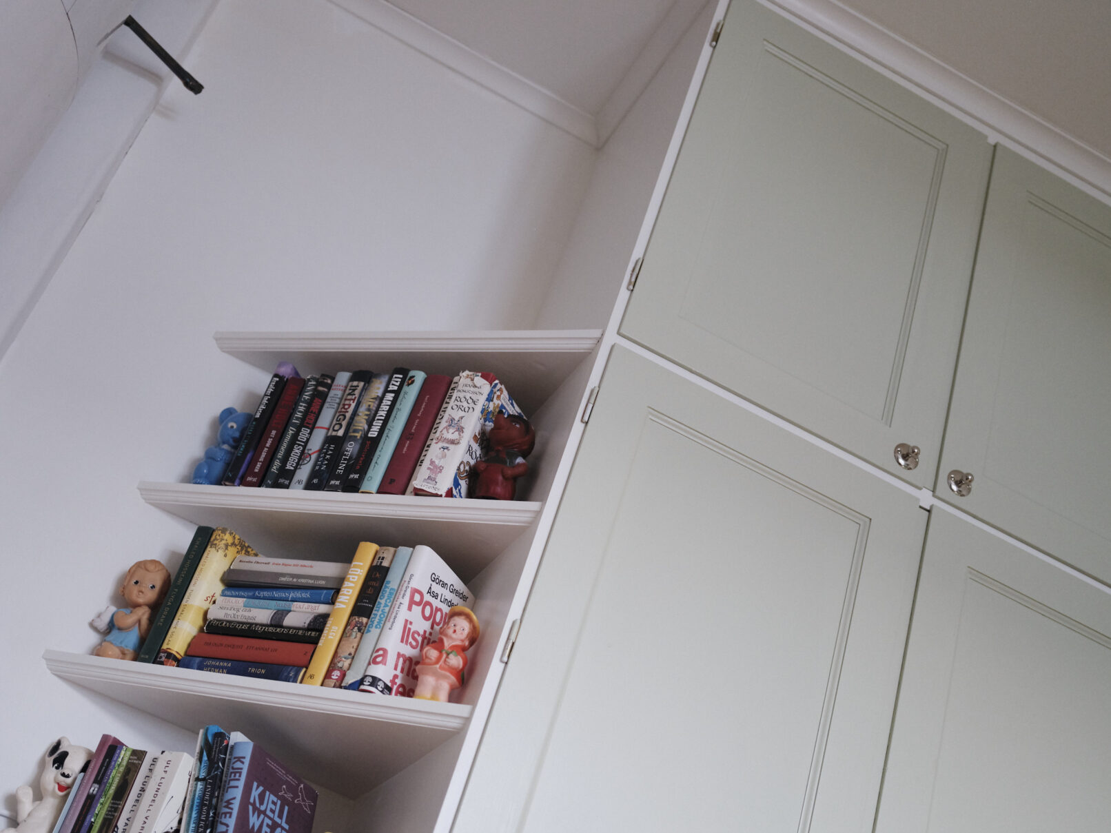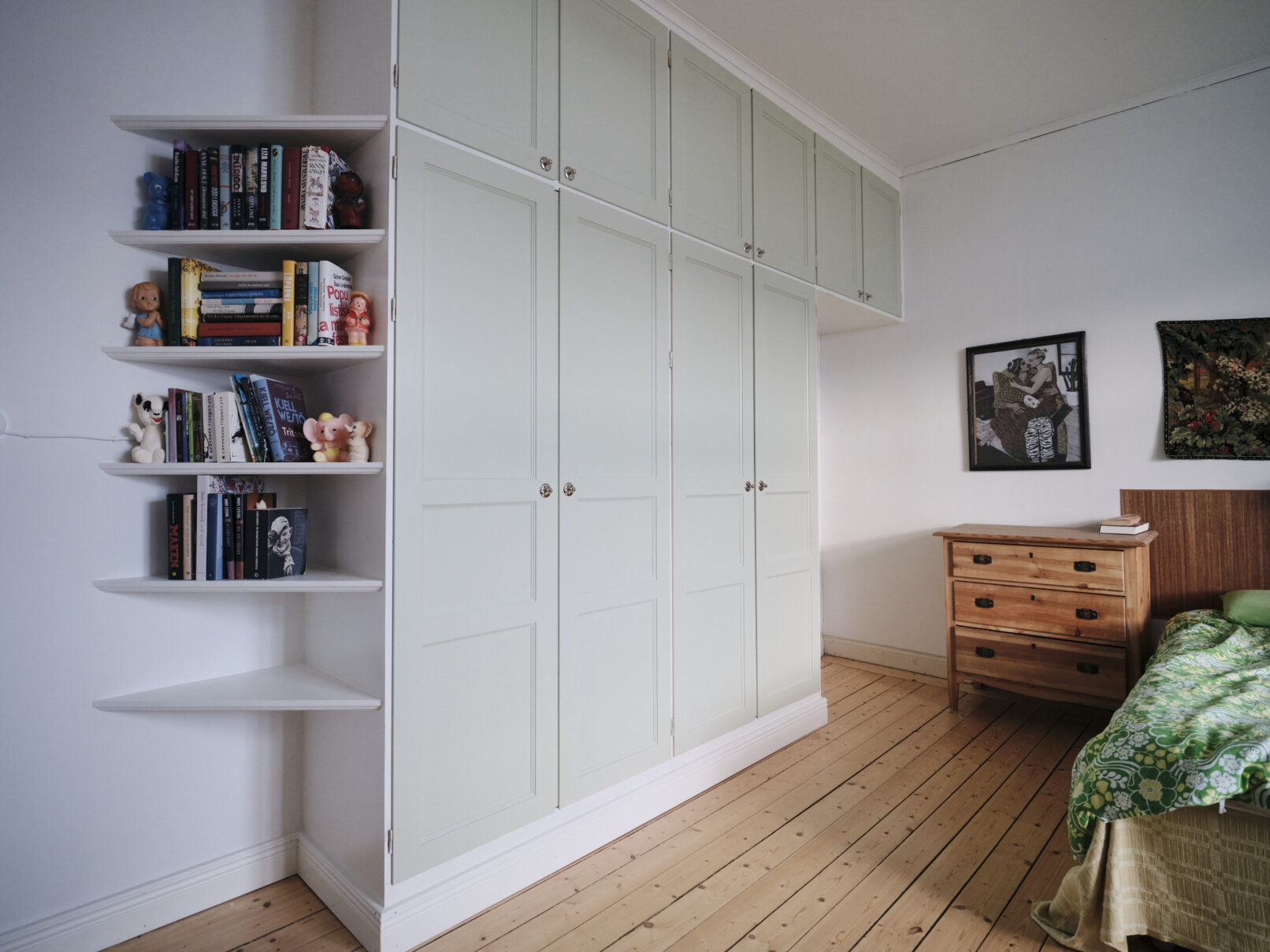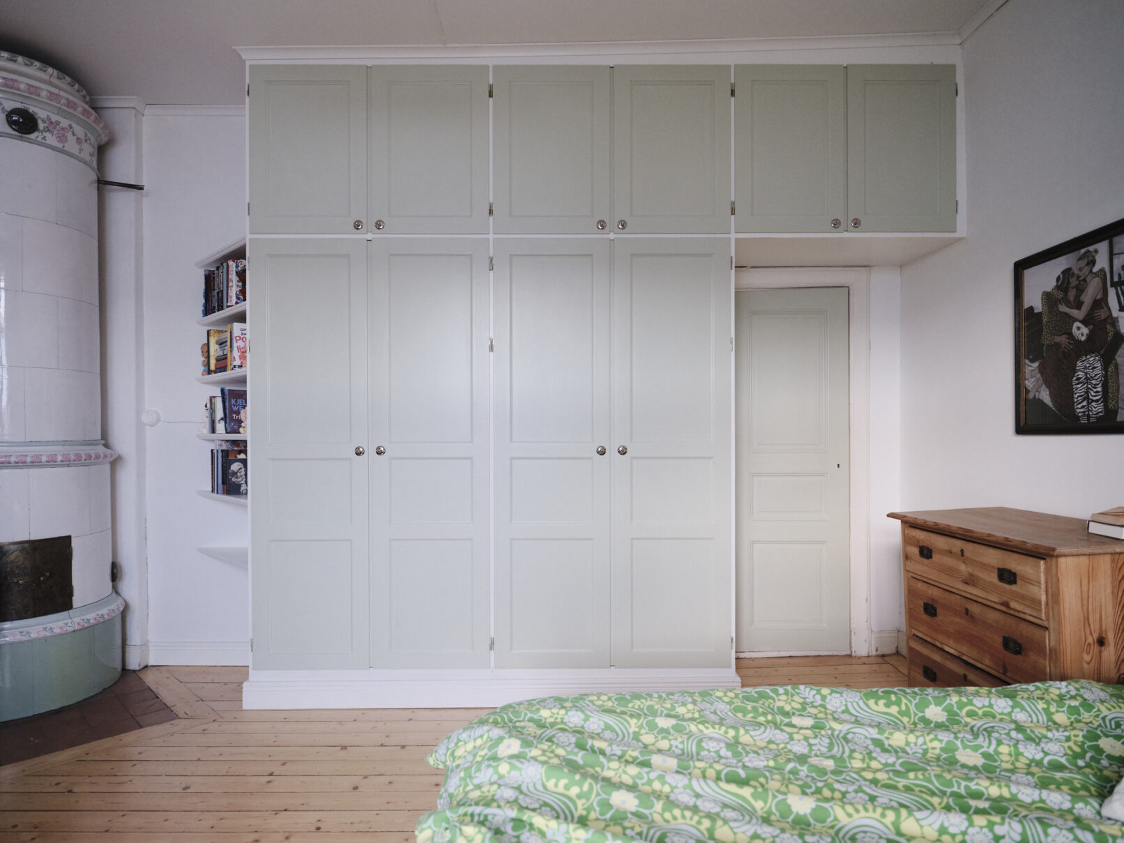 Platsbyggt garderobssystem. Byggt runt toadörr.