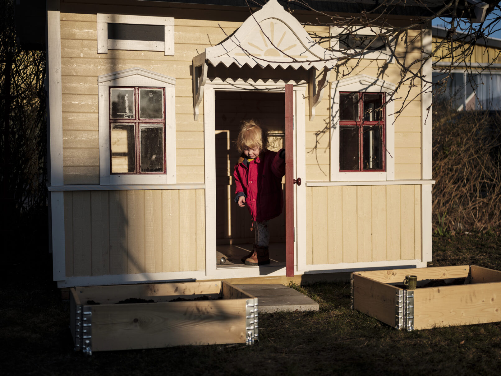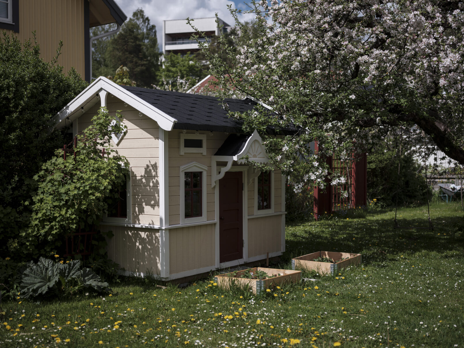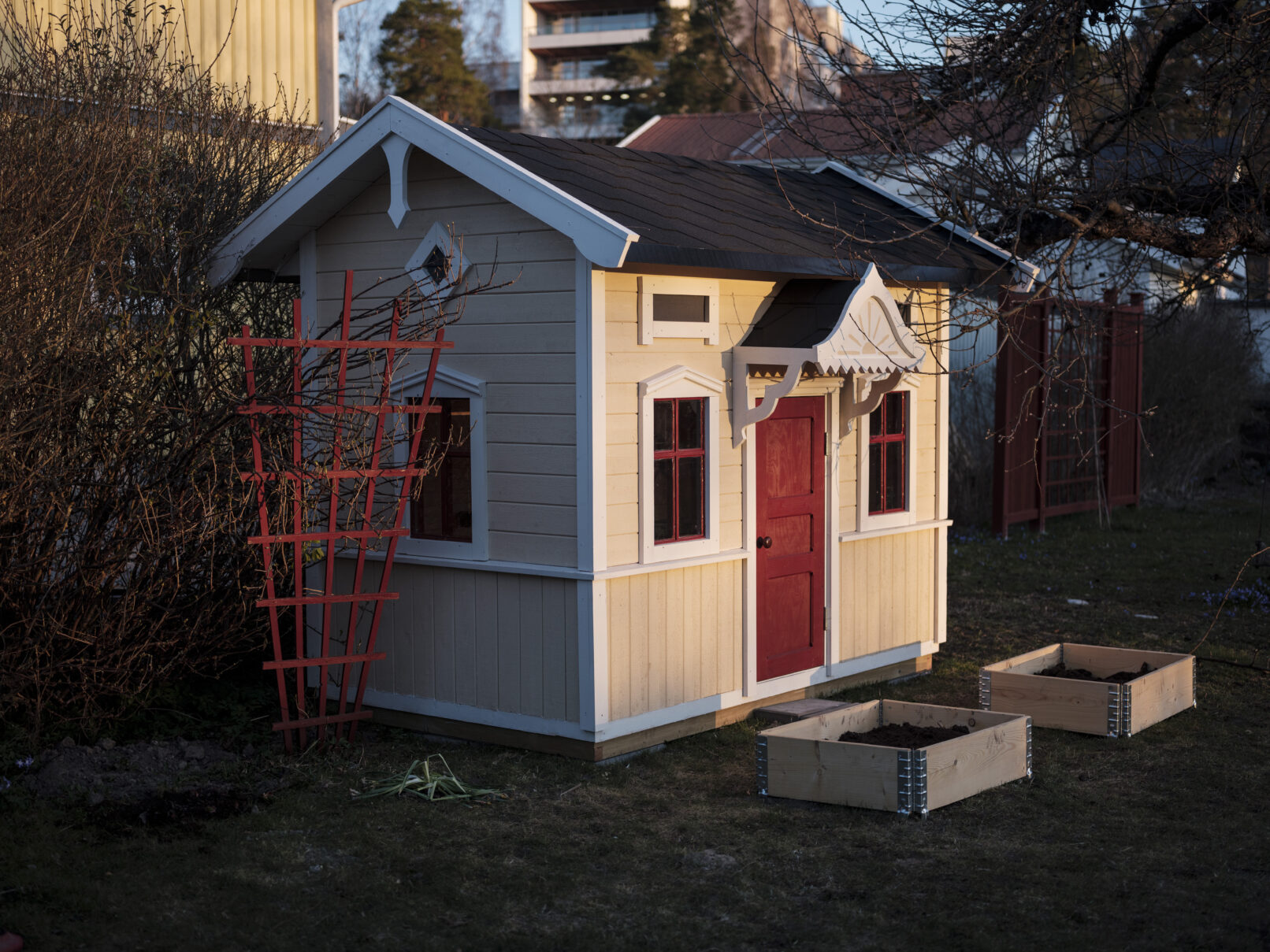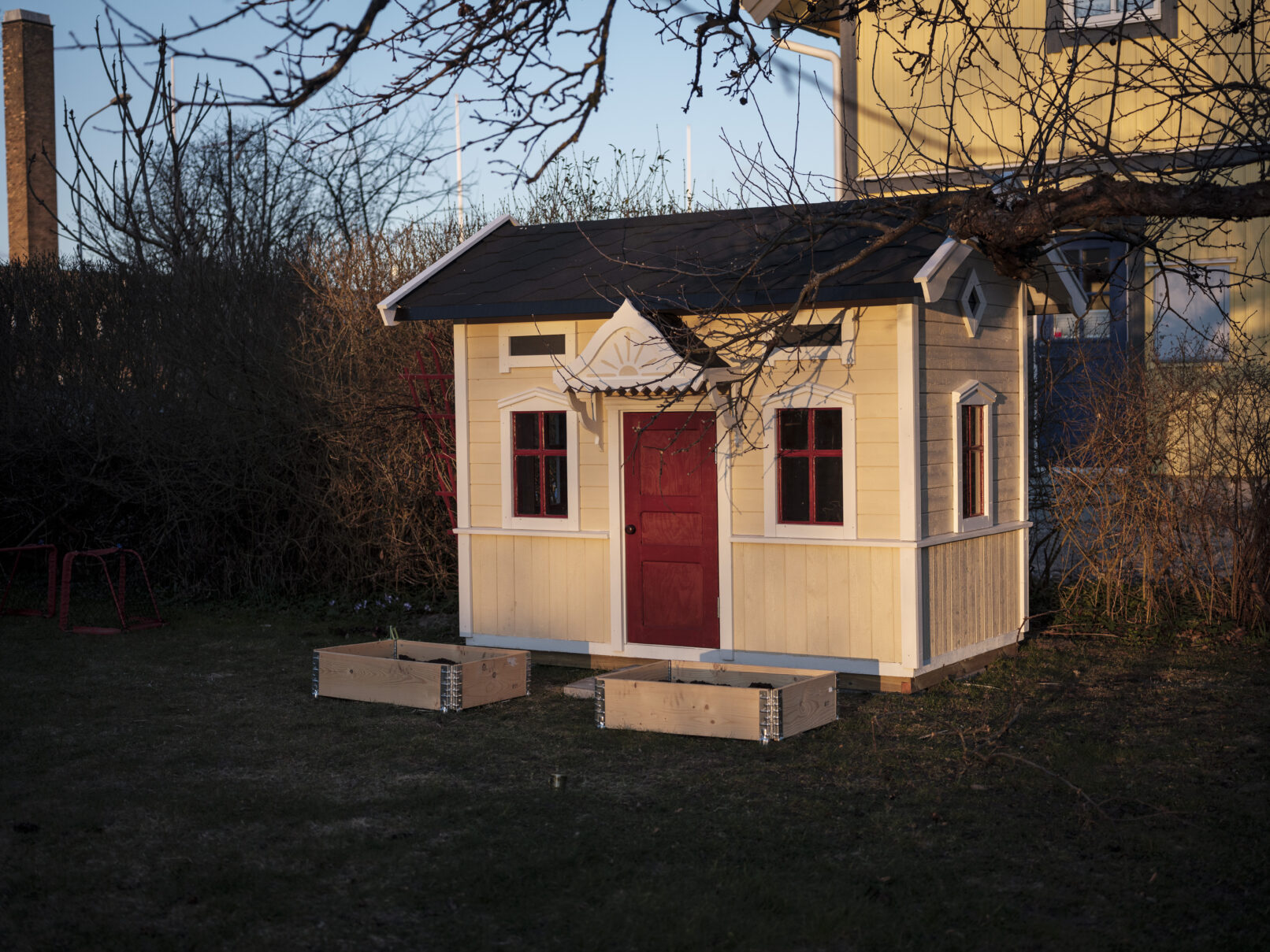 Lekstuga med kittade fönster, spegeldörr, shingeltak