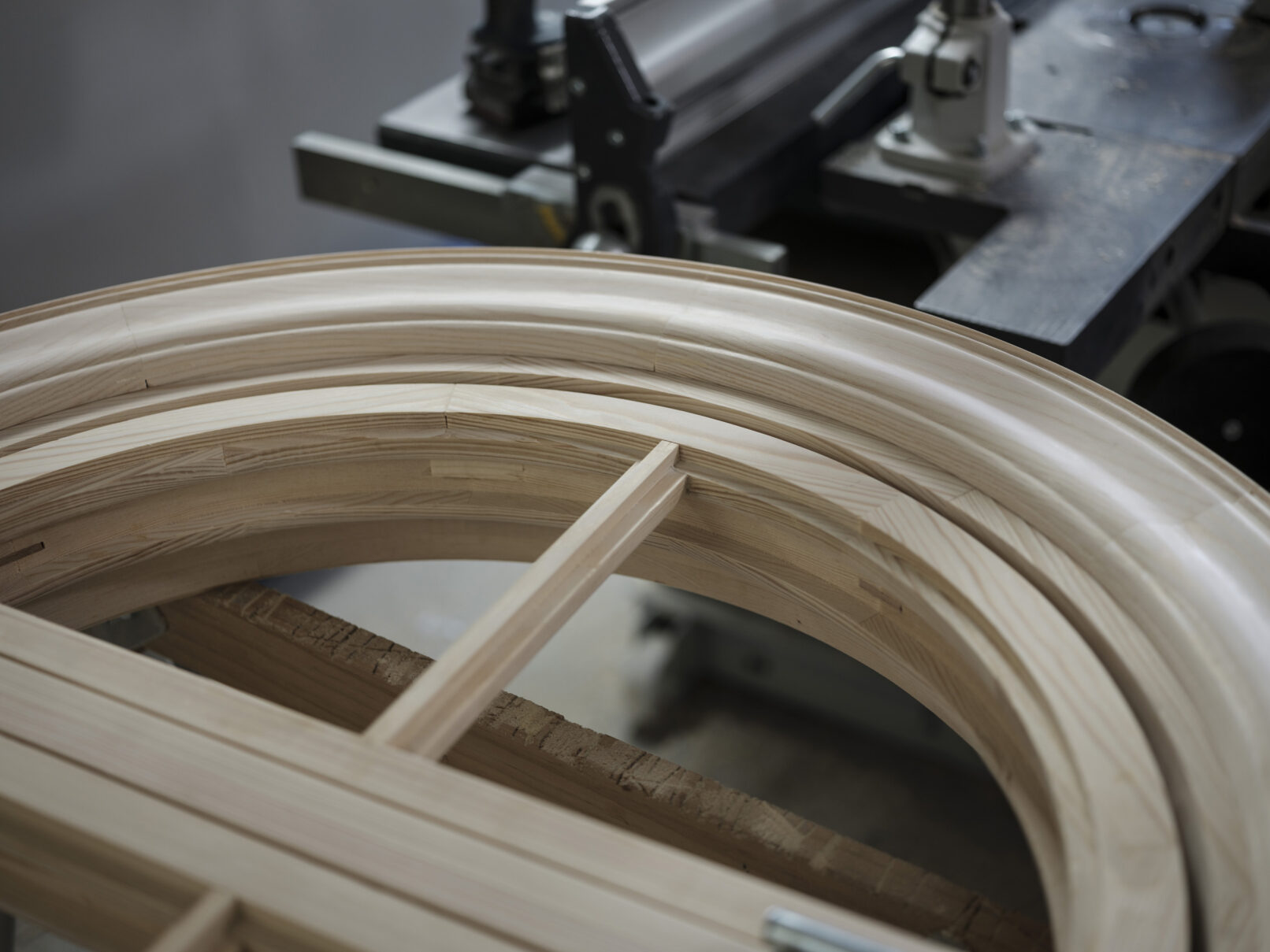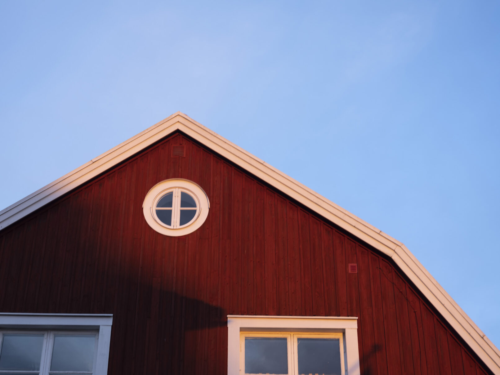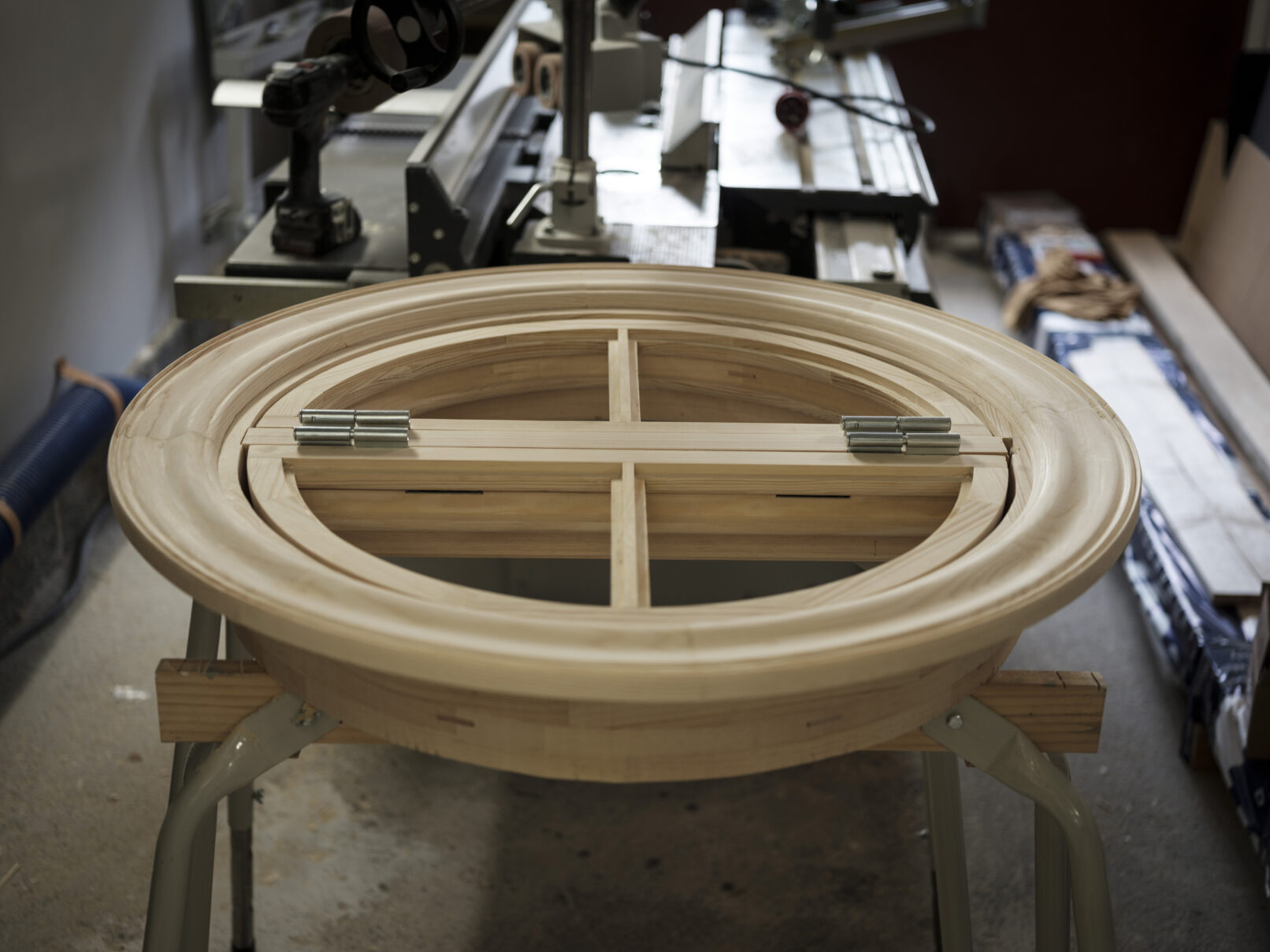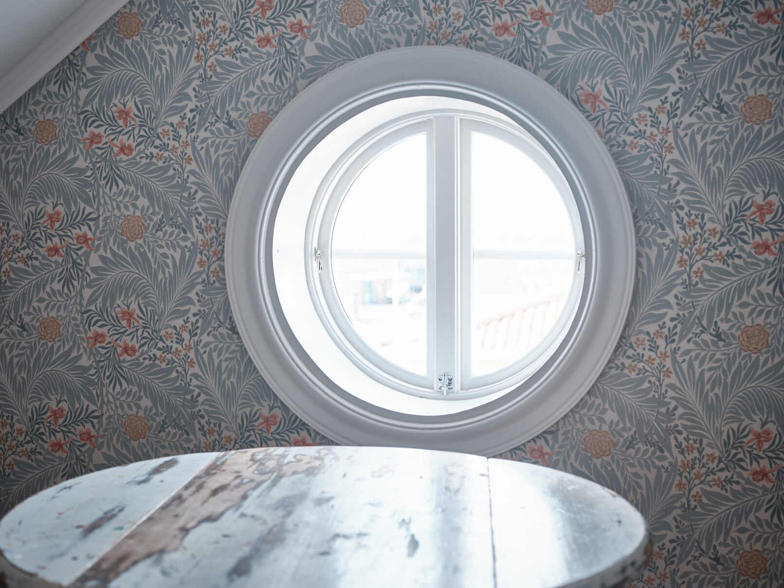 Öppningsbart vindsfönster med runt foder fräst i samma profil som övriga foder.